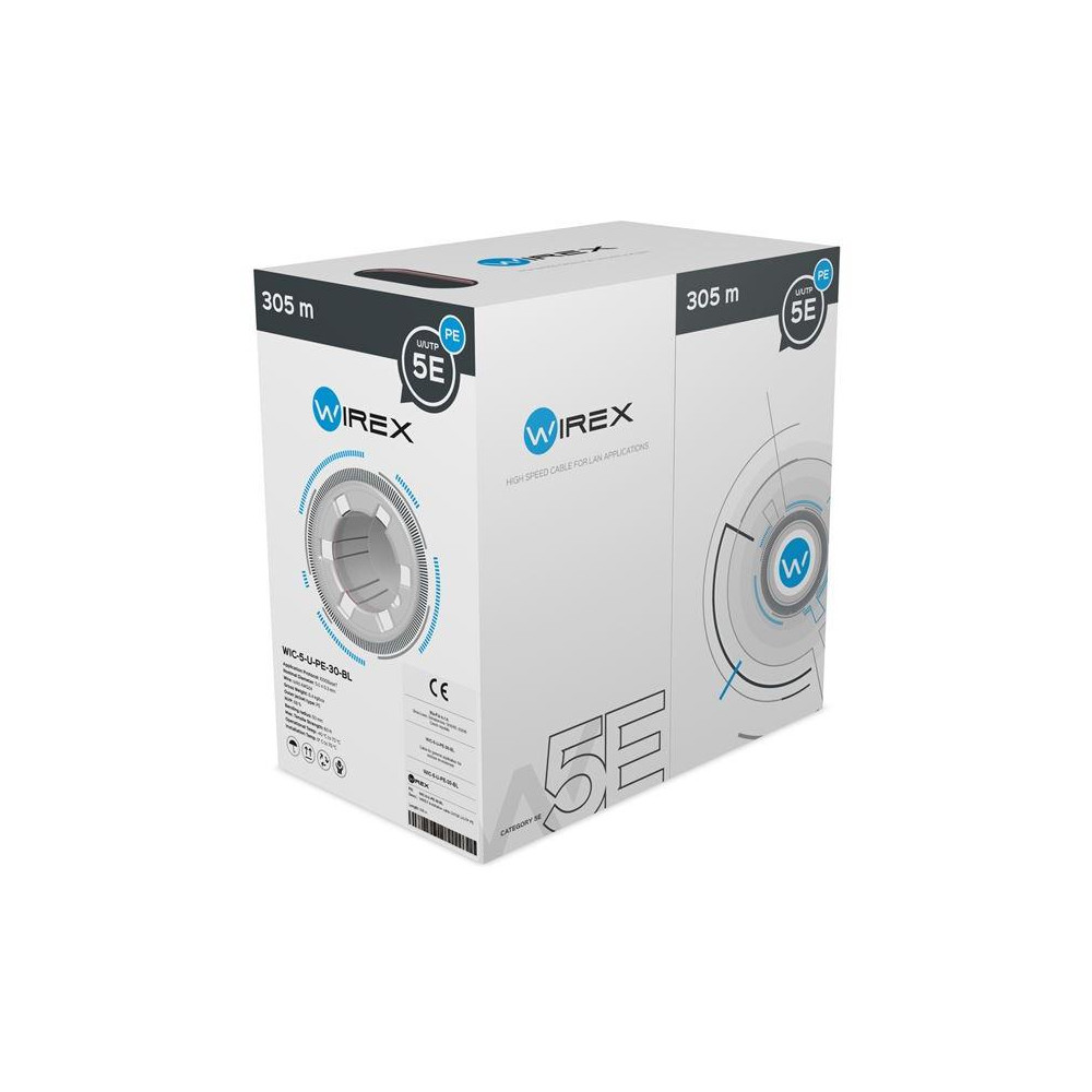 Instalační kabely WIREX se vyznačují vysokou spolehlivostí a stabilitou parametrů po celou dobu životnosti instalované metalické datové sítě. Zvládají nejnáročnější přenosové protokoly, které je možno dle standardů provozovat na kabelážích kategorie CAT5E. Tento typ kabelu je možno instalovat ve venkovním prostředí, kde kvalitní plášť odolává jak teplotním podmínkám, tak i slunečnímu záření. Kabel je dodáván v barevném boxu, díky kterému je možno rychle rozpoznat, o jaký typ kabelu se jedná v případě instalace, kde se používá několik typů kabelů. Pro přehlednost je metráž kabelu značena od 0 m do 305 m.