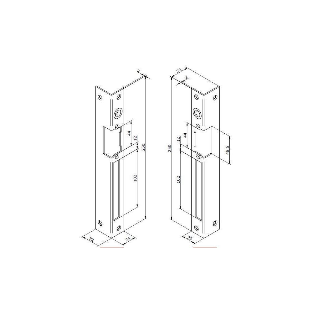 Protiplech/lišta dlouhá, rohová, pro uchycení el.zámku do zárubně.Délka: 250mm.Barva: světle šedá nebo zlatá.Vhodné pro uchycení SYMETRICKÉHO el. zámku do dřevěných zárubní.Použití pro pravé dveře.Protiplech/lišta má větší otvor pro závoru mech. dveřního zámku.