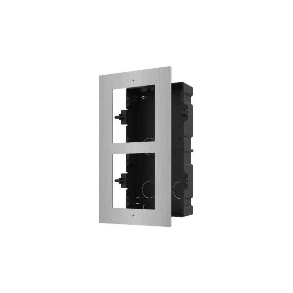 Nerezový rámeček modulárního interkomu Hikvision DS-KD-ACF2/S Určeno pro zápustnou montáž  Lze osadit 2 moduly interkomu (IP i 2-žilový)  Obsahuje příslušenství k montáži Materiál:  broušená ocel, plastový box Rozměry krycího rámečku: 236 x 124 × 4 mm Rozměry montážního boxu / otvoru pro box: 219 x 107 × 45 mm
